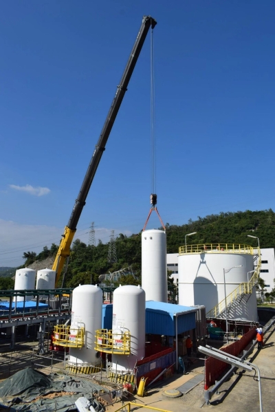 10月26日,广东大鹏液化天然气有限公司(下称“广东大鹏LNG”)接收站液氮系统改造项目作业现场,在一阵热烈的掌声和欢呼声中,重达19吨、高约12米的T-9602液氮储罐和两台600Nm³/h的空湿式气化器成功吊装就位,标志着该项目现场设备安装全面展开,为年底项目完工打下坚实基础。 项目位于广东大鹏LNG接收站公用工程区域,受道路和场地狭窄、周边设施密集、临近有架空管廊和淡水储罐等在役设施的制约,液氮储罐和气化器吊装作业面临极大困难和挑战。其中T-9602液氮储罐为立式罐,空重19.3吨、高约12米、外直径约3.8米,须跨越管廊、淡水储罐等在役设备,为项目单体最高、作业难度最大的设备,可谓项目顺利进行的一块“硬骨头”。 为了确保吊装作业顺利进行,广东大鹏LNG接收站项目部联合QHSE部、营运部、承包商做了大量准备工作。沙盘演练、风险分析、实施方案研究讨论,技术团队到作业现场实测实量,并对汽车起重机吨位的选用、站位、回转半径、吊臂高度、变幅摆臂进行精确计算。经过各团队精确计算和周密分析,决定选用1台450T的GROVE超大型汽车起重机和1台80T的汽车起重机配合实施吊装作业,以增加吊装安全系数。 10月26日,在作业现场,按照前期的计算和演练,经过近2个小时紧张有序的吊装作业,T-9602液氮储罐一次就位,罐体底座孔径与预埋地脚螺栓对接实现零误差。 接收站液氮系统改造项目是广东大鹏LNG“安全生产专项整治三年行动”的重要攻坚任务之一,项目完成后对降低生产成本和增加氮气供应能力有重要意义。自去年项目启动以来,广东大鹏LNG克服疫情影响等诸多困难,重点落实、持续推进项目进程,力求为安全生产和保供大湾区筑牢又一道防线。目前,该项目各项工作按计划稳步推进,预计年底完工投产。